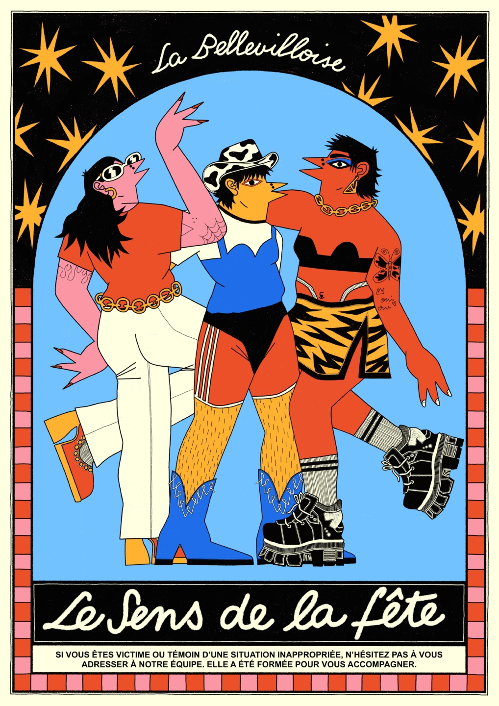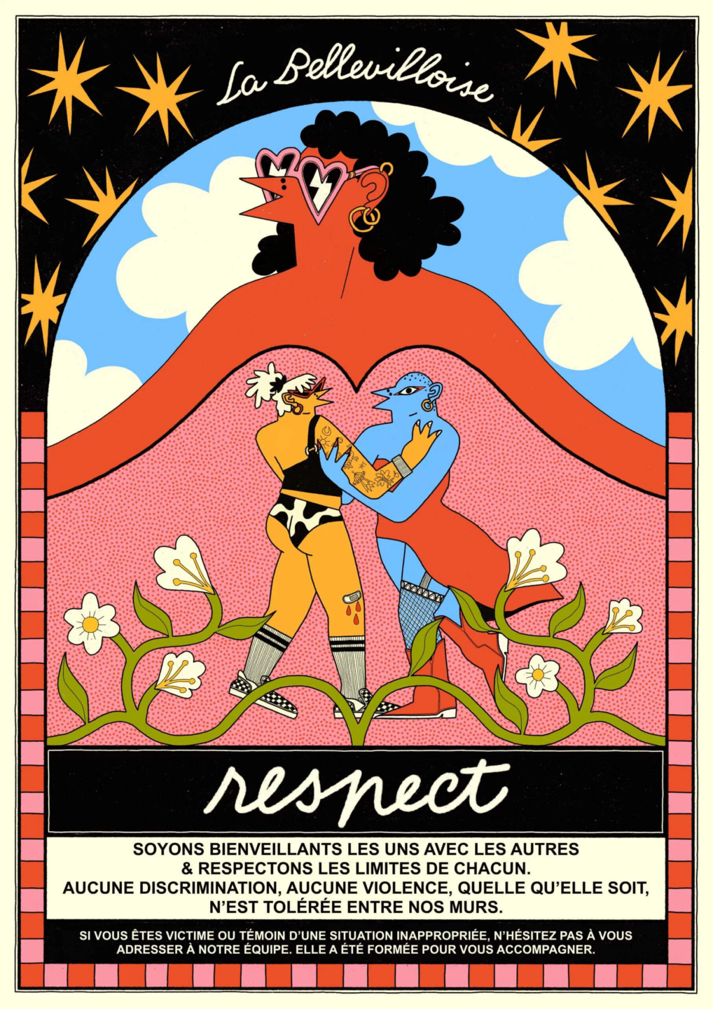 Pour lutter contre les violences et harcèlements sexistes et sexuels, nous avons travaillé avec l’illustratrice belge Petrouchkaka afin de mettre en images une charte de comportement à destination de notre public comme de nos équipes. Elle est visible partout dans notre lieu et permet de rassembler le public de la Bellevilloise autour d’un pacte de valeurs communes.