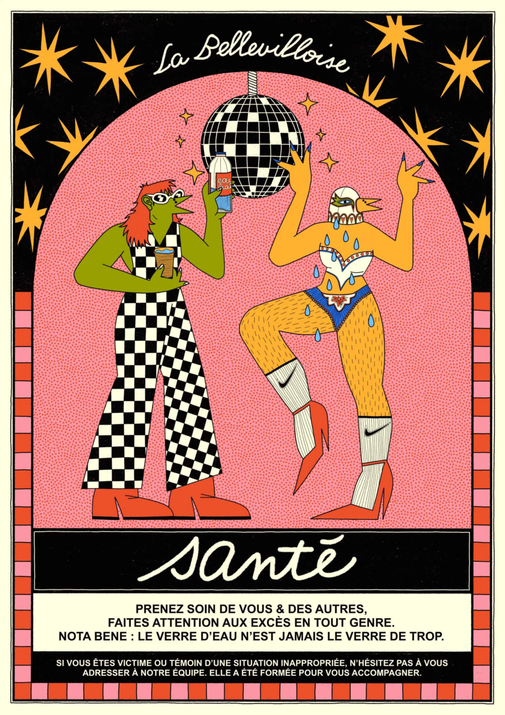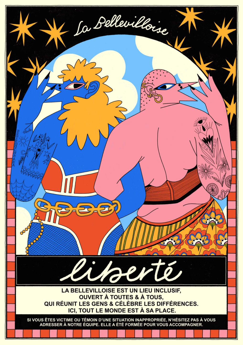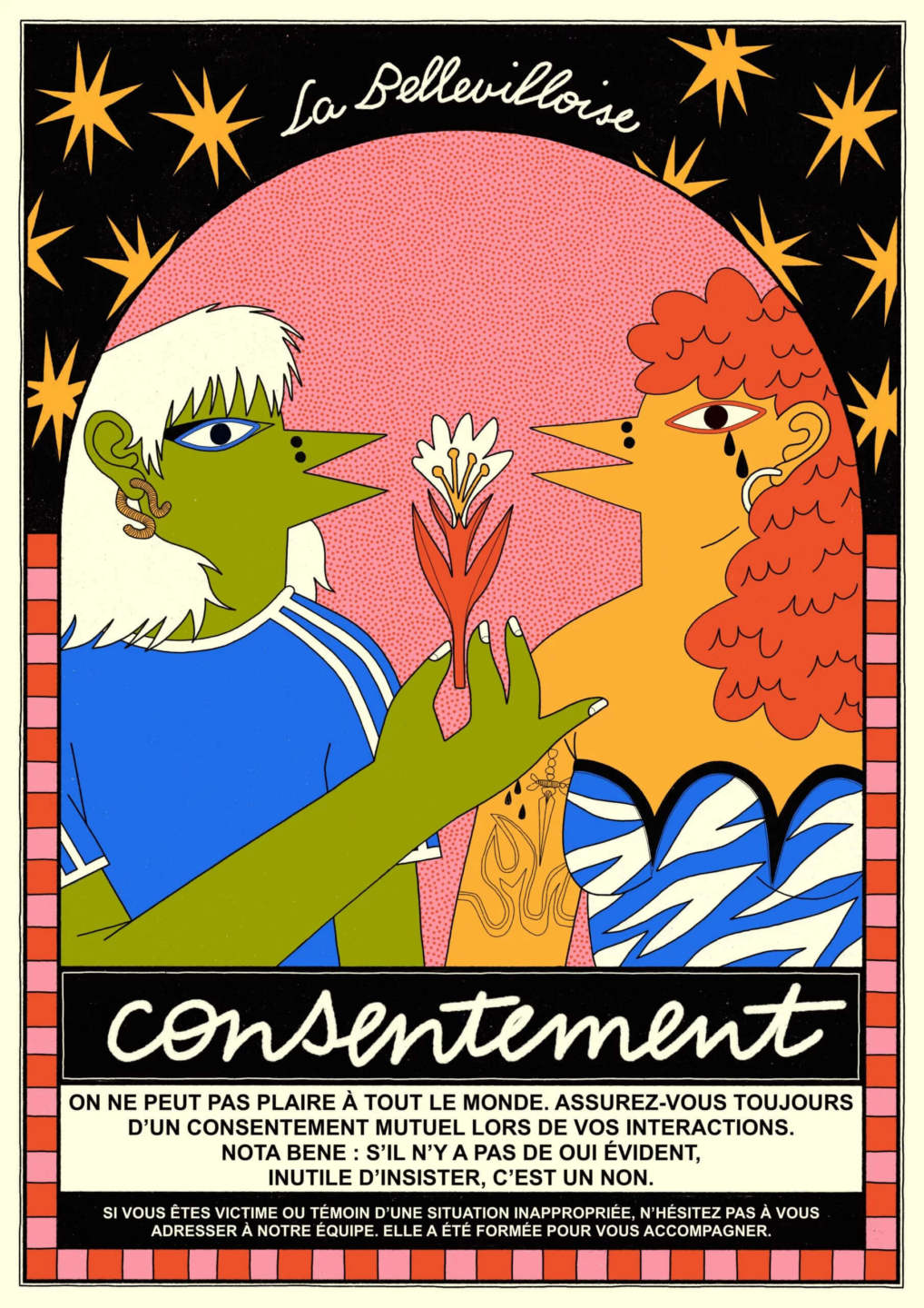 Pour lutter contre les violences et harcèlements sexistes et sexuels, nous avons travaillé avec l’illustratrice belge Petrouchkaka afin de mettre en images une charte de comportement à destination de notre public comme de nos équipes. Elle est visible partout dans notre lieu et permet de rassembler le public de la Bellevilloise autour d’un pacte de valeurs communes.